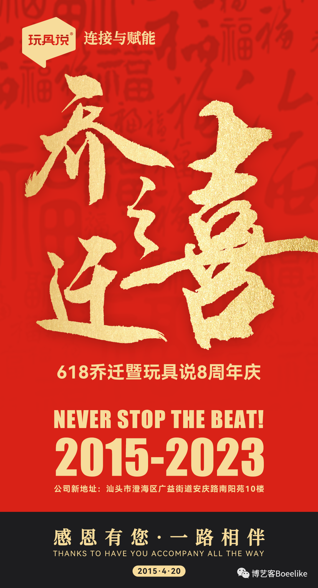 618公司喜迁新址暨8周年庆 新环境,新起点,新征程 怀着感恩之心,继续砥砺前行 感恩有您,一路相伴 博艺客(品牌"玩具说")——连接与赋能,是一家玩具产业链服务商。运营有玩具说网、图灵AI创意库、软件方案、会展服务、影视工场等业务。